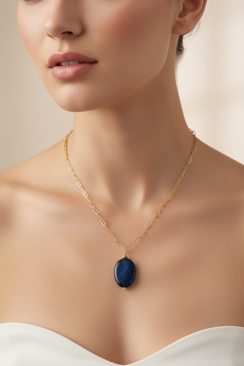 This necklace beautifully combines the organic beauty of natural agate with the modern appeal of a paper clip chain. The vibrant blue tones make a statement while remaining versatile enough for both casual and dressy occasions. The substantial gemstone pendant paired with the trendy chain creates a look that's both contemporary and timeless, perfect for those who appreciate unique, artisan jewelry with a modern twist.